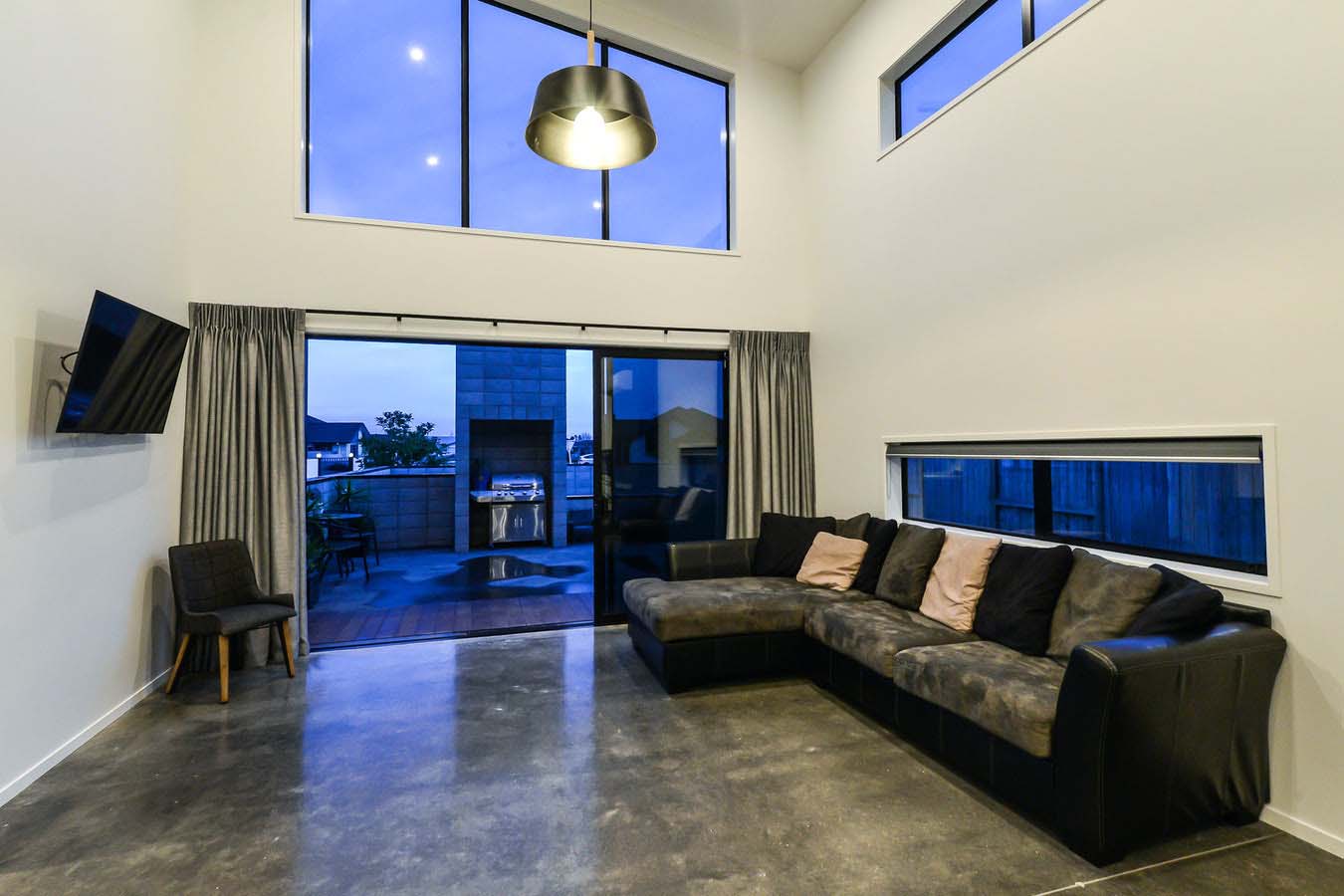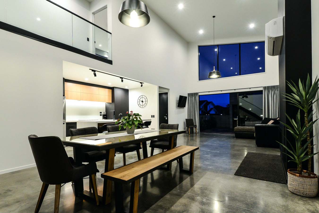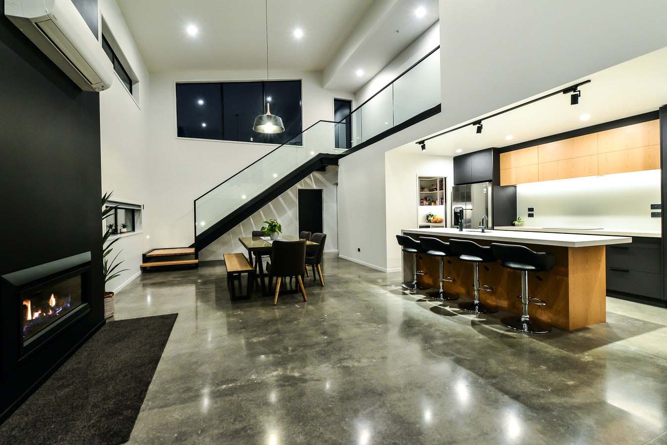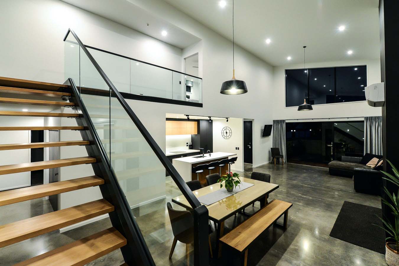 The bespoke build in the growing area of Borman Road, Hamilton is a contemporary family home finished with style and quality. This high end home has the ultimate level of indoor and outdoor flow with alfresco entertainment and deck placement; perfect for entertaining guests, or spending time with family. The open concept layout creates a seamless flow throughout the home. The kids have their own rooms downstairs while upstairs remains the master suite. A combination of modern construction materials comprising of Longrun steel cladding, masonry block and timber creates this high end finish. Inside features an industrial look through negative detailing, polished charcoal concrete floors, an open riser staircase and a lofty ceiling that reaches to the sky. Overall the bespoke Borman Road build has a high level of comforts, all while providing low maintenance living and lifestyle convenience.