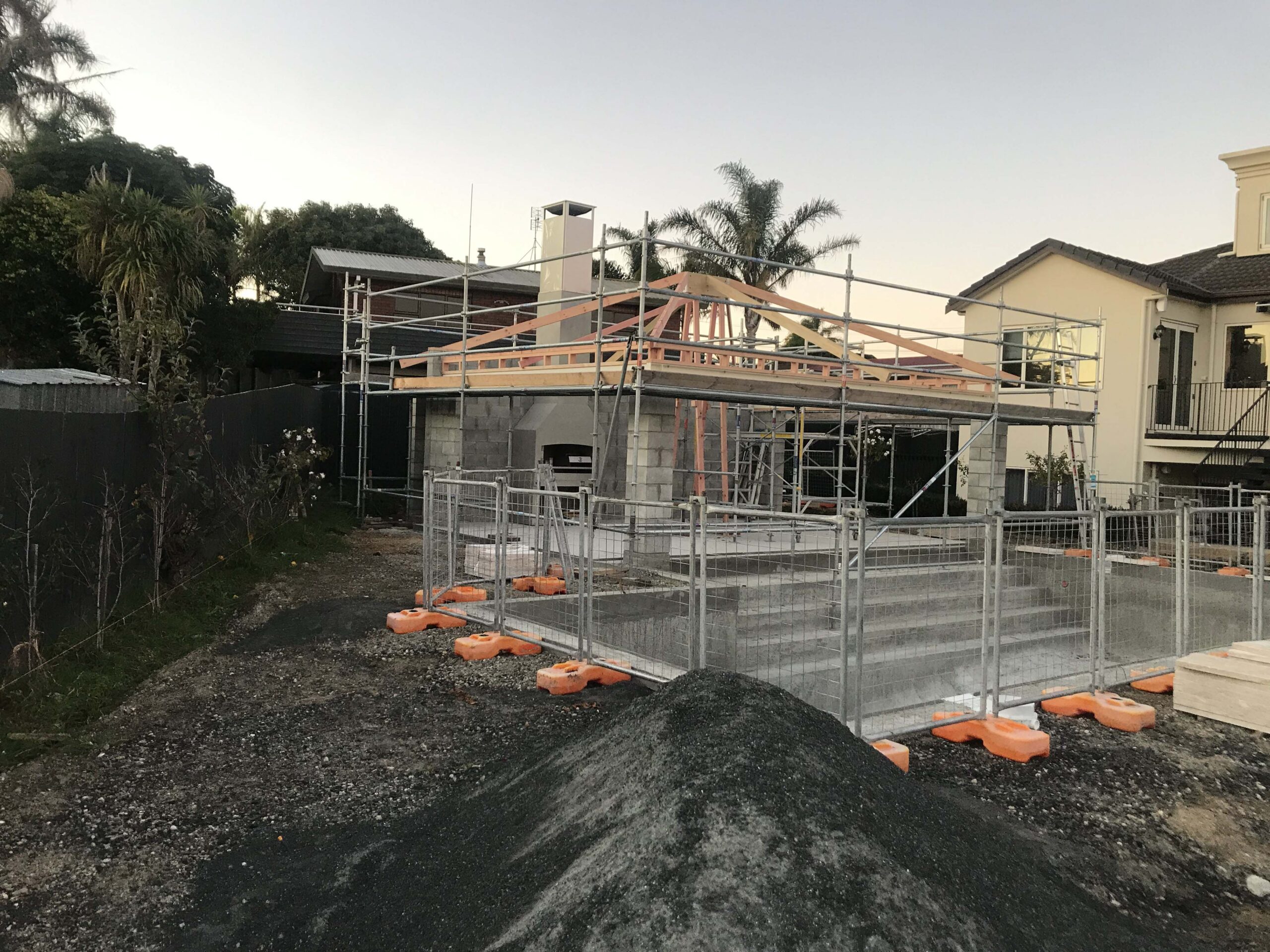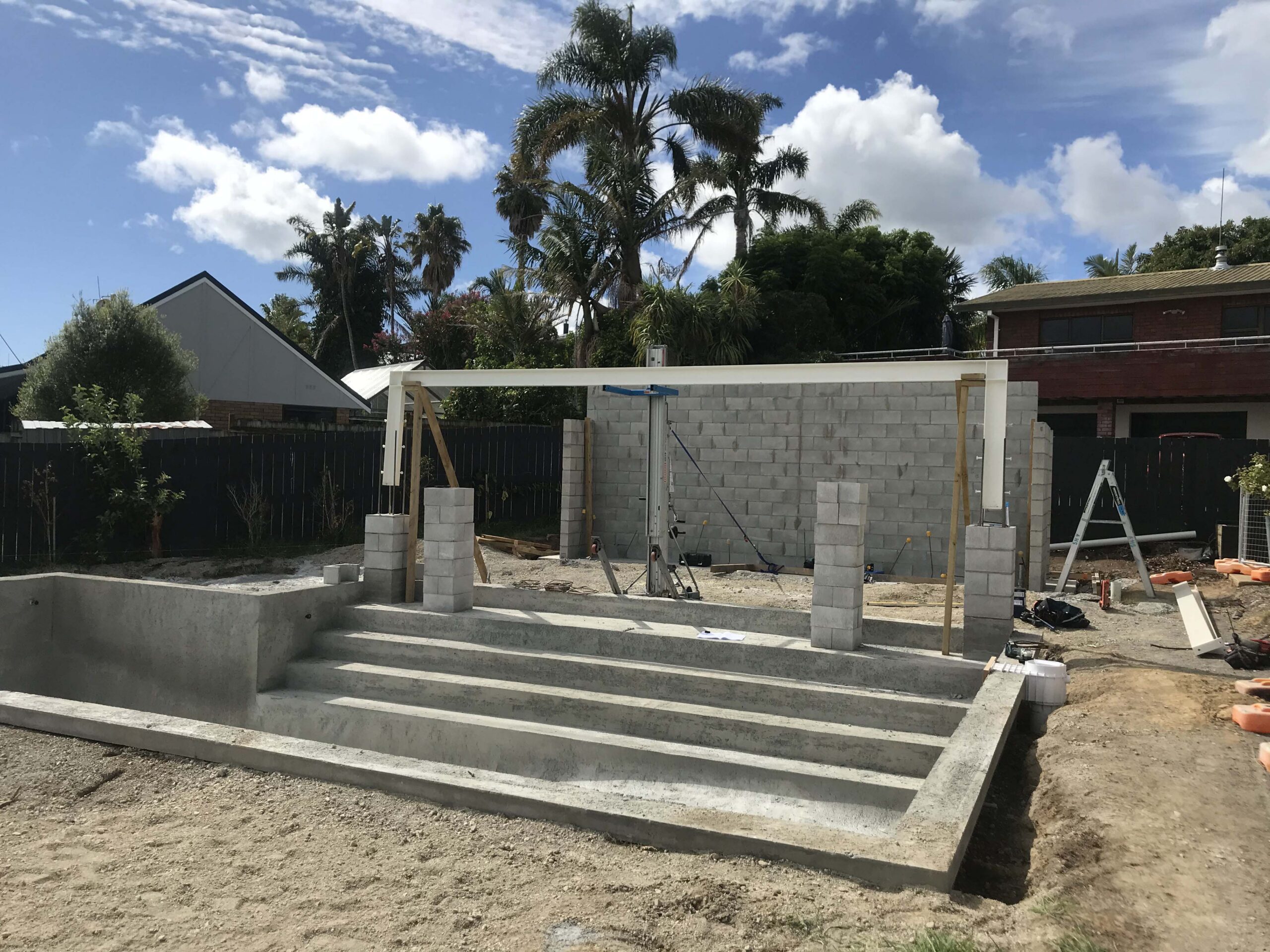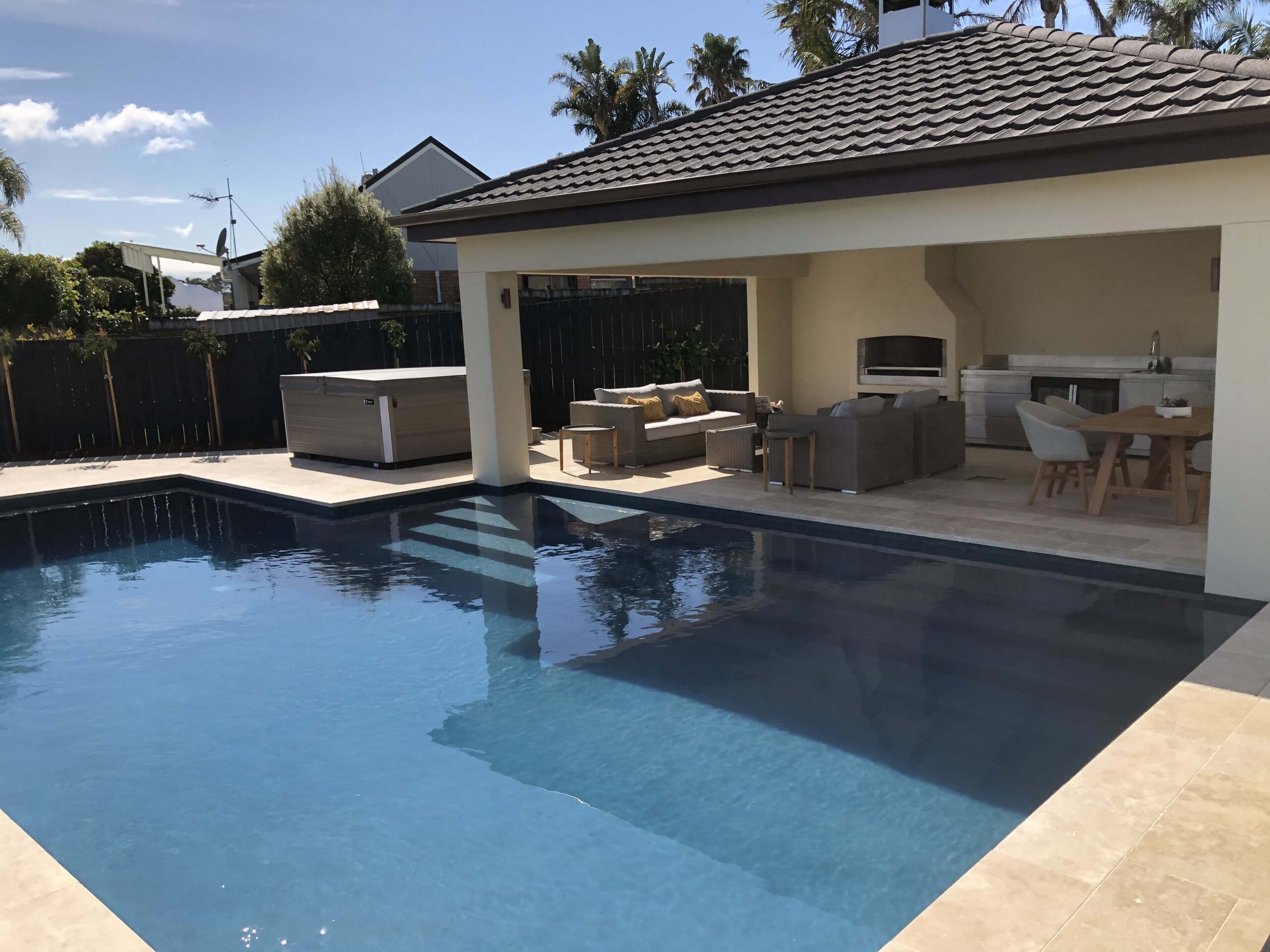The family transformed their outdoor area into the ultimate summer space. AHS constructed a pool house which included an outdoor kitchen and a pizza oven to keep the family and guests entertained while spending the summer days poolside. In the pool house, exposed rafters with a vaulted ceiling created the feature roof. The pool itself was constructed by Del Tutto Pools.